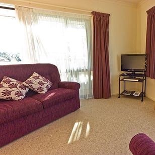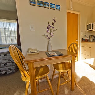 This sunny, bright, upstairs 1 bedroom unit has a comfortable king bed (or 2 twin single beds if preferred), an ensuite with shower, well equipped cooking facilities, flat screen TV and DVD player, and two single sofa beds. It also has a balcony off the lounge looking out to the back beach and across to the mountains.