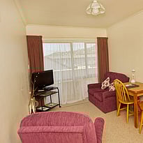 This upstairs 1 bedroom unit has a bathroom with shower, a separate toilet, comfortable king bed, (twin single beds available if preferred), cooking facilities, flat screen TV and DVD player, an armchair, a two-seater couch and a balcony off the lounge.